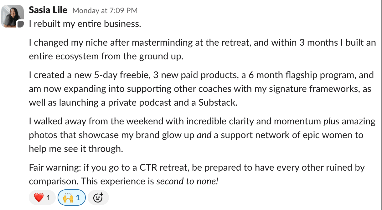 Reader, Three days to actually CREATE the things you’ve been meaning to put out there for months. Three days of 1:1 coaching, support, and feedback from me to help you make the right decisions, take aligned action, and accomplish more than you have all year. You’ll leave with a business plan that drives your most profitable (and peaceful) quarter yet, along with all the content you need to bring that plan to life – in just three days. I’m looking for three women (spots are filling up) who are ready to work with me in person in this capacity. We won’t be just brainstorming. We’ll be executing. We’ll be creating, implementing, and moving your business forward. You’ll see more growth and breakthroughs in our three days together than you would in months spent working alone. Reply with “CAMP” and I’ll send you more details, or apply now to save your spot. P.S. – When you reply with “CAMP,” I’ll reply as soon as I return from vacation with my family (the first week of August). You can also reach out to Madeline, our retreat creative director, here, and she’ll be happy to help you out even sooner! We’ll be back with your usual weekly inspiration in August, but in the meantime—if you’re new here or just catching up, here are 3 ways we can still stay connected: